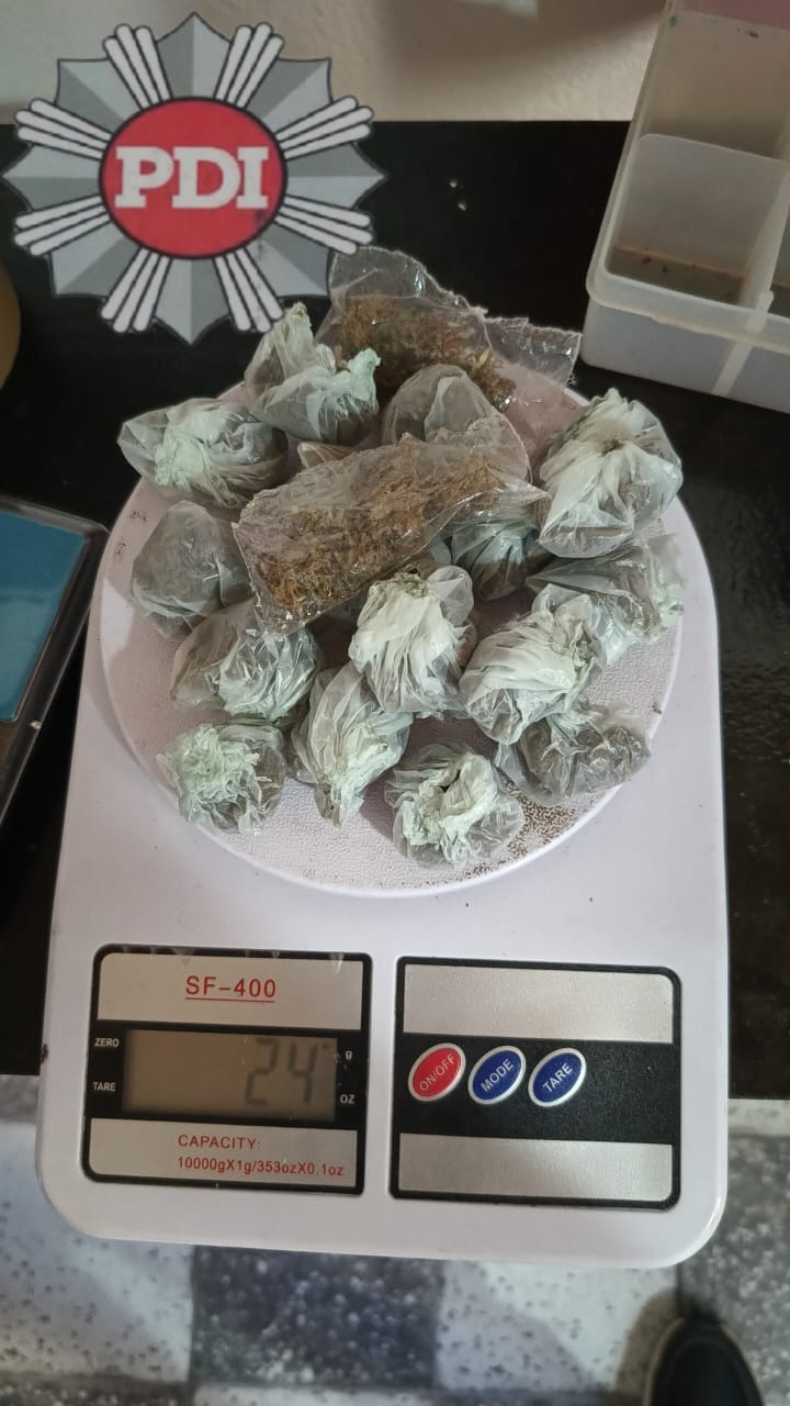 Durante la inspección en dicha vivienda, los agentes de la PDI incautaron veinte envoltorios de nylon que contenían una sustancia vegetal con características similares a la marihuana, además de una balanza digital de precisión y diversos recortes de nylon utilizados para el fraccionamiento. Asimismo, se procedió al secuestro de un teléfono celular con la pantalla dañada y la suma de 23.300 pesos en efectivo. Debido a estas evidencias, el procedimiento fue caratulado como infracción a la Ley 23.737, bajo la figura de tenencia con fines de comercialización.