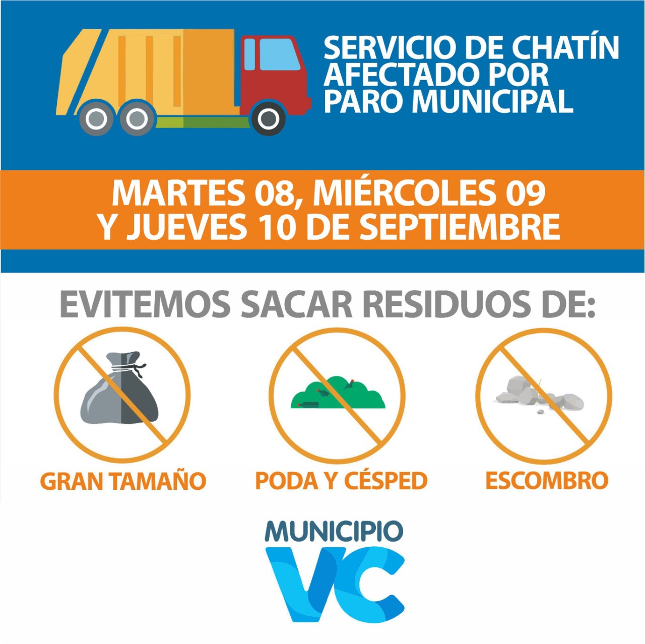 El Municipio de Villa Constitución comunica que con motivo del paro municipal de los días martes 8, miércoles 9 y jueves 10 de septiembre no habrá servicio de CHATÍN, por lo que se solicita no sacar residuos de gran tamaño, escombros, poda y césped.