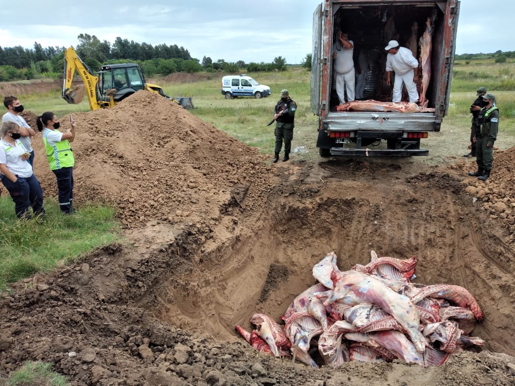 Una enorme cantidad de mercadería vacuna fue encontrada en mal estado. Después de los trámites de infracción correspondientes, enterraron la carne.