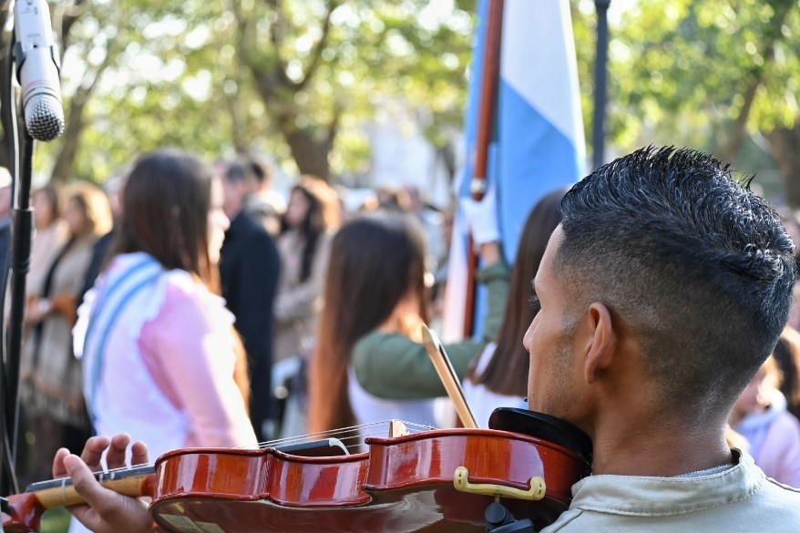 La flauta de pan marcó la nota inicial, violines, chelos y guitarras obedeciendo ese sonido original comenzaron a entonar el himno nacional. Sus estrofas fueron narradas en lengua qom por un coro de estudiantes de las escuelas de la modalidad intercultural bilingüe San Juan Diego y Roberto Fontanarrosa que, protegidos por los lanceros, emocionaron al auditorio, el pasado 7 de junio, en el que se encontraron referentes indígenas, funcionarios y estudiantes de la comuna de Puerto Gaboto.